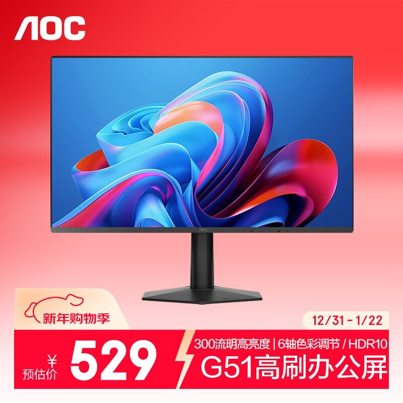 AOC 24G51F 定位为高性价比Fast IPS电竞显示器,采用24英寸1920×1080分辨率面板,兼顾细腻画质与高速响应,适合竞技类游戏与日常影音娱乐。三边窄边框设计拓展视野范围,黑色磨砂机身搭配多角度可调支架,支持高度、俯仰与水平旋转调节,满足不同坐姿与使用场景需求,并可通过VESA壁挂灵活布设。