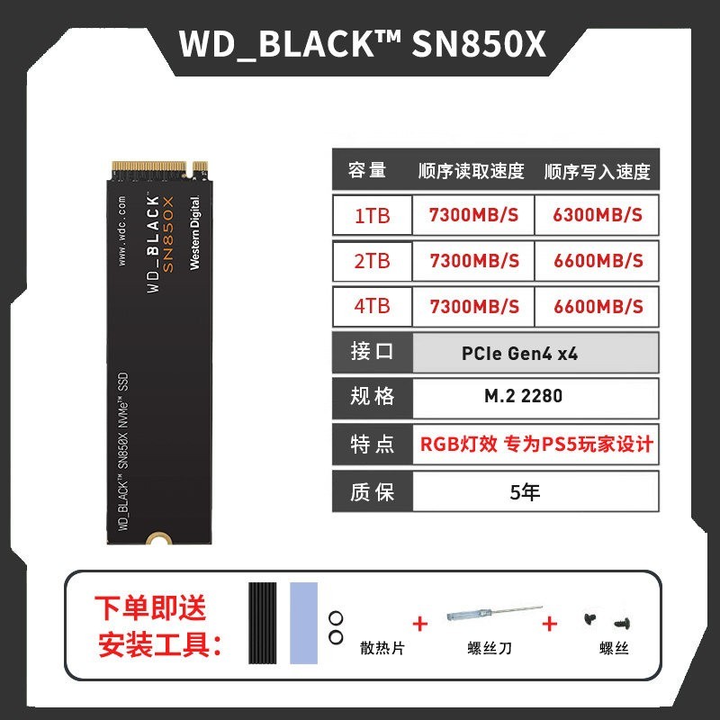 西部数据 SN850x 1T 顺序读取速度高达约 7300MB/s,写入速度亦可突破 6300MB/s,随机读写性能卓越,能显著缩短系统启动、软件加载与文件传输时间。搭载独立缓存与智能预加载算法,在高负载下依旧维持稳定吞吐,并支持游戏模式(Game Mode 2.0)优化延迟表现,提升游戏场景响应速度。采用 M.2 2280 标准规格与高效散热贴设计,适配台式机与笔记本,安装便捷且利于机箱空间利用。